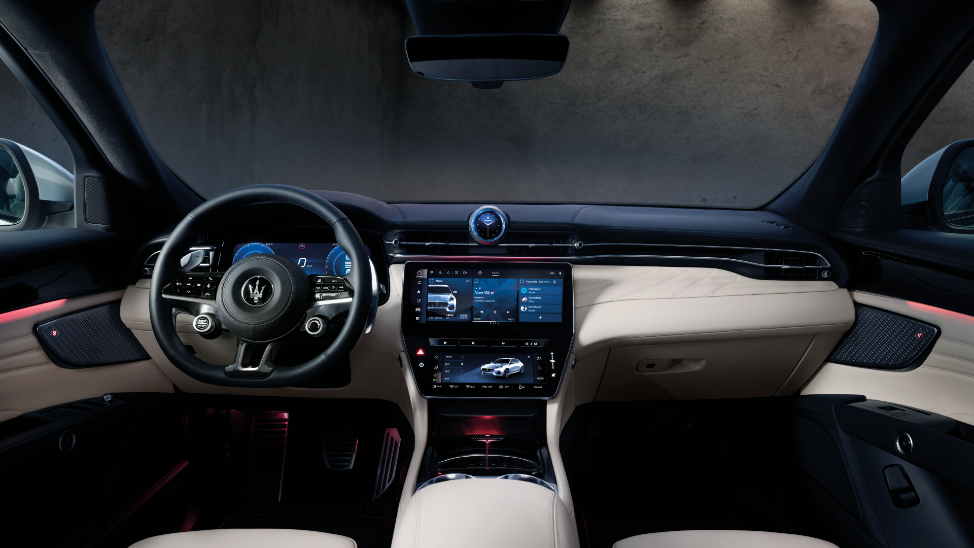 Assistant(MIA)智能多媒體系統的 12.3 吋中央觸控螢幕,與下方可調整空調、座椅、燈光等功能設置的 8.8 吋多功能觸控螢幕,透過一體式玻璃面板連接成為完整中控介面,而 Maserati